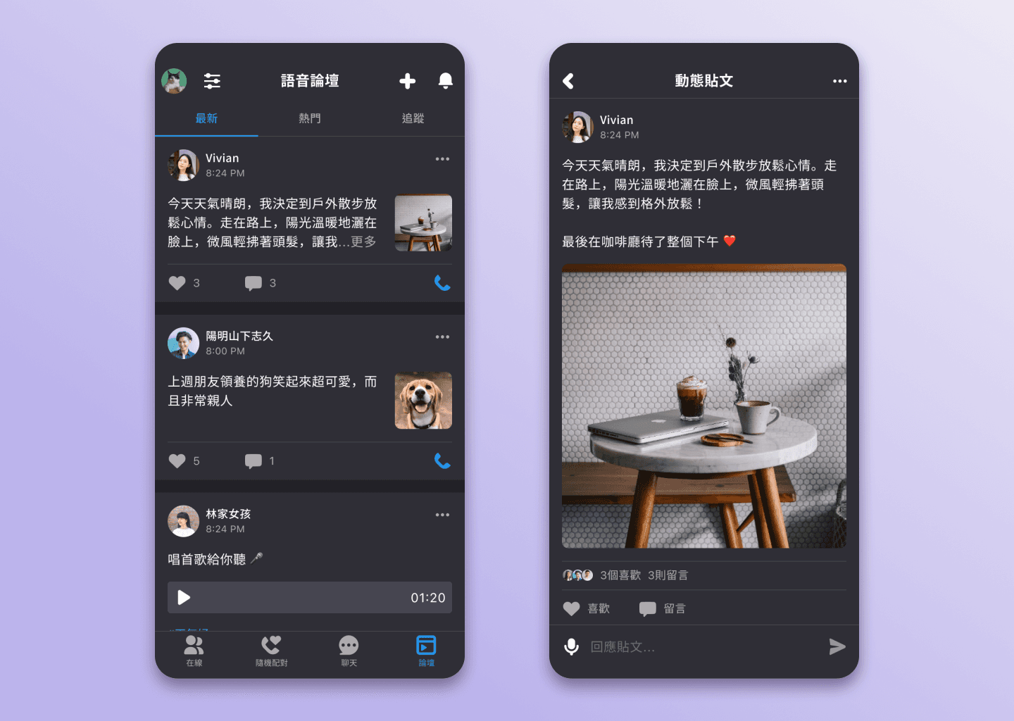 首先,我們配合整個應用程式的介面改版,略微調整樣式,讓各個功能看起來更具一致性。接著,我們將列表從條列式改為社群媒體主流的「卡片式」設計,以符合用戶的心智模型。這項改進不僅讓用戶能夠看到更完整的貼文內容,還能針對內容進行互動,例如瀏覽個人主頁、點擊喜歡、留言,甚至是直接與作者通話。