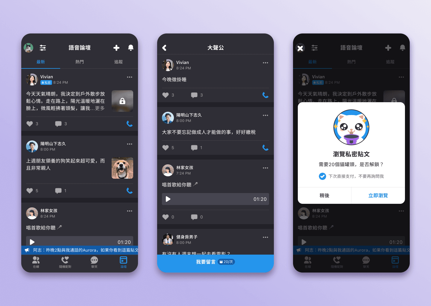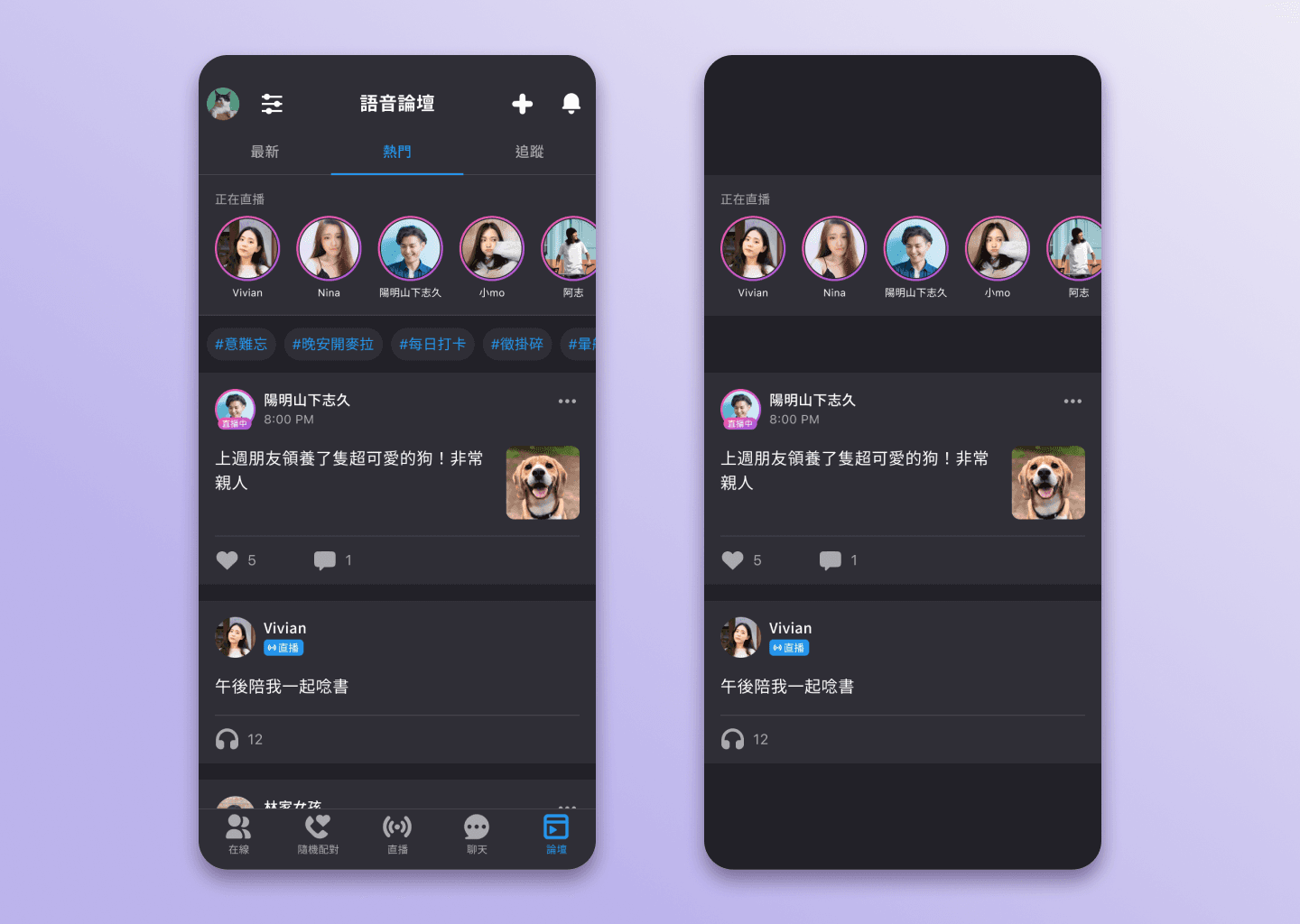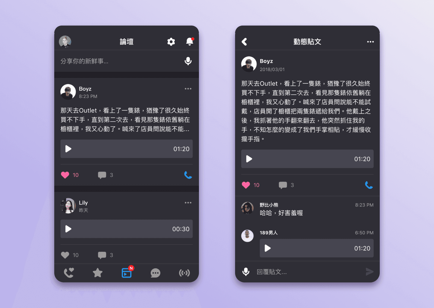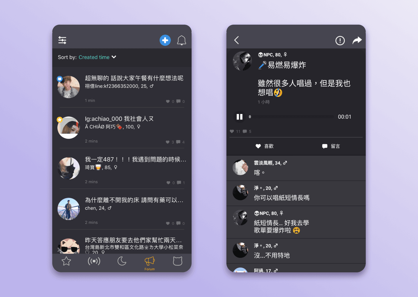 最開始「聲音論壇」主要是團隊用來嘗試 growth hacking 的功能,希望透過網頁版加上行銷達到擴散並導流,但對於功能本身並未認真評估與規劃。然而在後續觀察中,我們發現論壇非常適合用戶在未使用通話功能的期間進行互動,讓他們更快速地找到志同道合的朋友,進而提高社群的凝聚力。