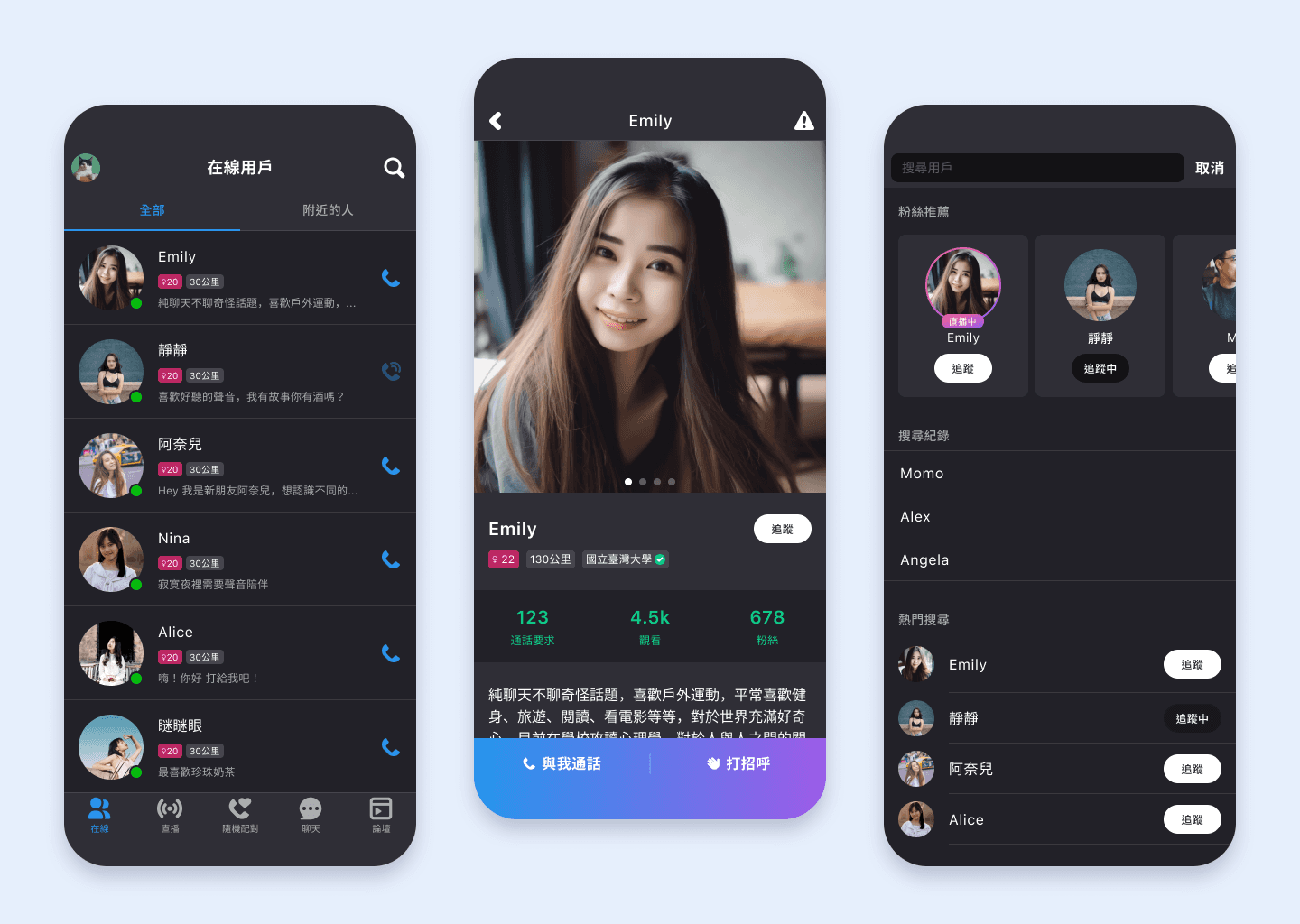 在 Goodnight 內有三種基本通話模式,1. 隨機配對的匿名通話、2. 在線用戶及好友的直接通話、3. 嚴選用戶的視訊付費通話。