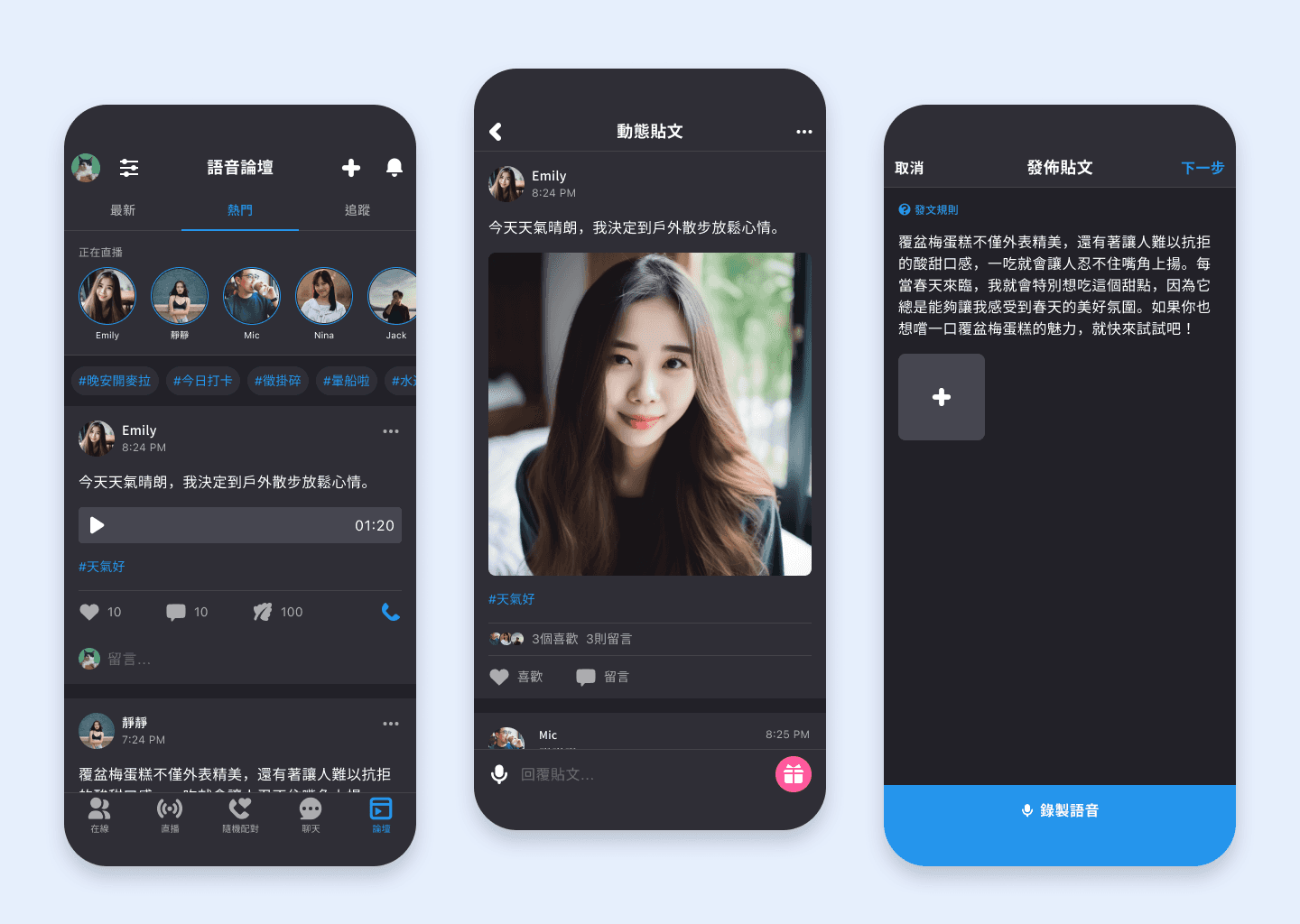 語音論壇是過去我們希望從網頁版增加 SEO 而嘗試的功能,初期的功能與介面如同陽春版的討論區,後續因為發現到用戶在配對之餘的時間也喜歡在論壇上互動,更從數據上觀察到論壇的活躍程度與配對是成正比的,因此我們在論壇新增更多社群類的功能,除了按讚、留言、送禮等互動,我們也調整貼文字數、增加貼文的語音與照片,並把每位用戶的文章整併至個人主頁中。