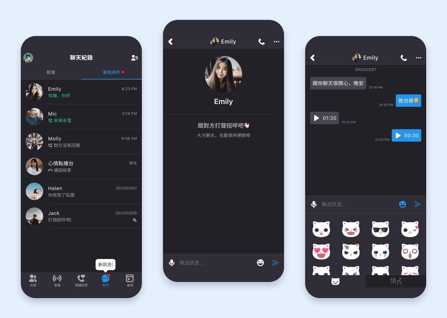 在隨機配對與用戶互加好友後,或曾有其他用戶的來電紀錄,便會於聊天紀錄新增彼此的聊天室。聊天室從最開始的文字訊息、語音訊息,慢慢加入表情符號、圖片、甚至是送禮等功能,整個聊天室功能更趨完整。我們也會透過此功能向用戶進行推廣客製化訊息或是客服。