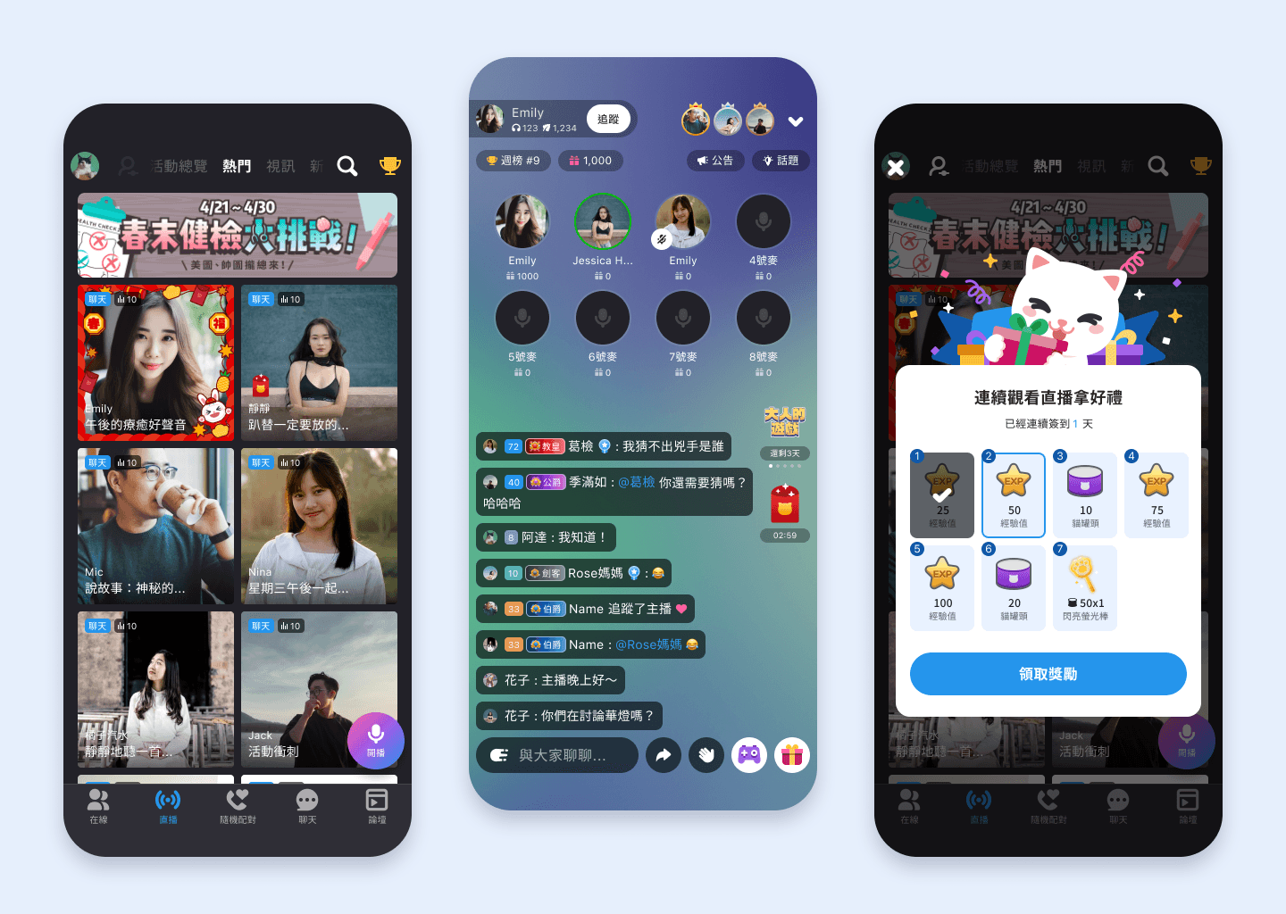 我們在將發展隨機配對的過程中,曾嘗試多人隨機配對(每次將會讓四個人一起進入同一通電話),用戶雖對此功能有高度的興趣很願意參與,但在數據結果與用戶訪談中瞭解到,該通電話必需要有一位類似主持人的角色才能讓大家的聊天更熱絡,我們從回饋中發現這與直播有高度正相關,因此也在 2020 年中推出語音直播的功能,並且讓每個直播間都能多人一起上麥聊天。在 DAU 起來後,我們開始慢慢加入付費轉換點,讓用戶們互相送禮,並且定期舉辦活動讓直播功能更加活躍,也刺激用戶付費轉換。