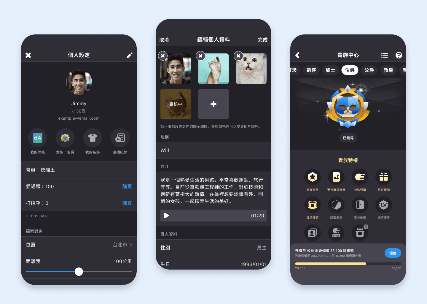 個人設定為 app 的基礎功能,用戶於此調整交友的偏好設定以及編輯個人資料,也能於此進行訂閱會員或儲值點數。在直播功能上線後,我們加入了更多成就系統的機制以激勵用戶,例如個人等級、儲值的貴族等級,乃至是個人裝飾、直播主的開播紀錄。