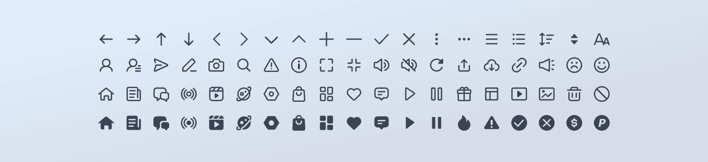 以簡單明確的線條呈現圖示,僅在表示啟用時 (actived) 或小尺寸時才以實心填滿呈現,降低使用者閱讀文章時的干擾。