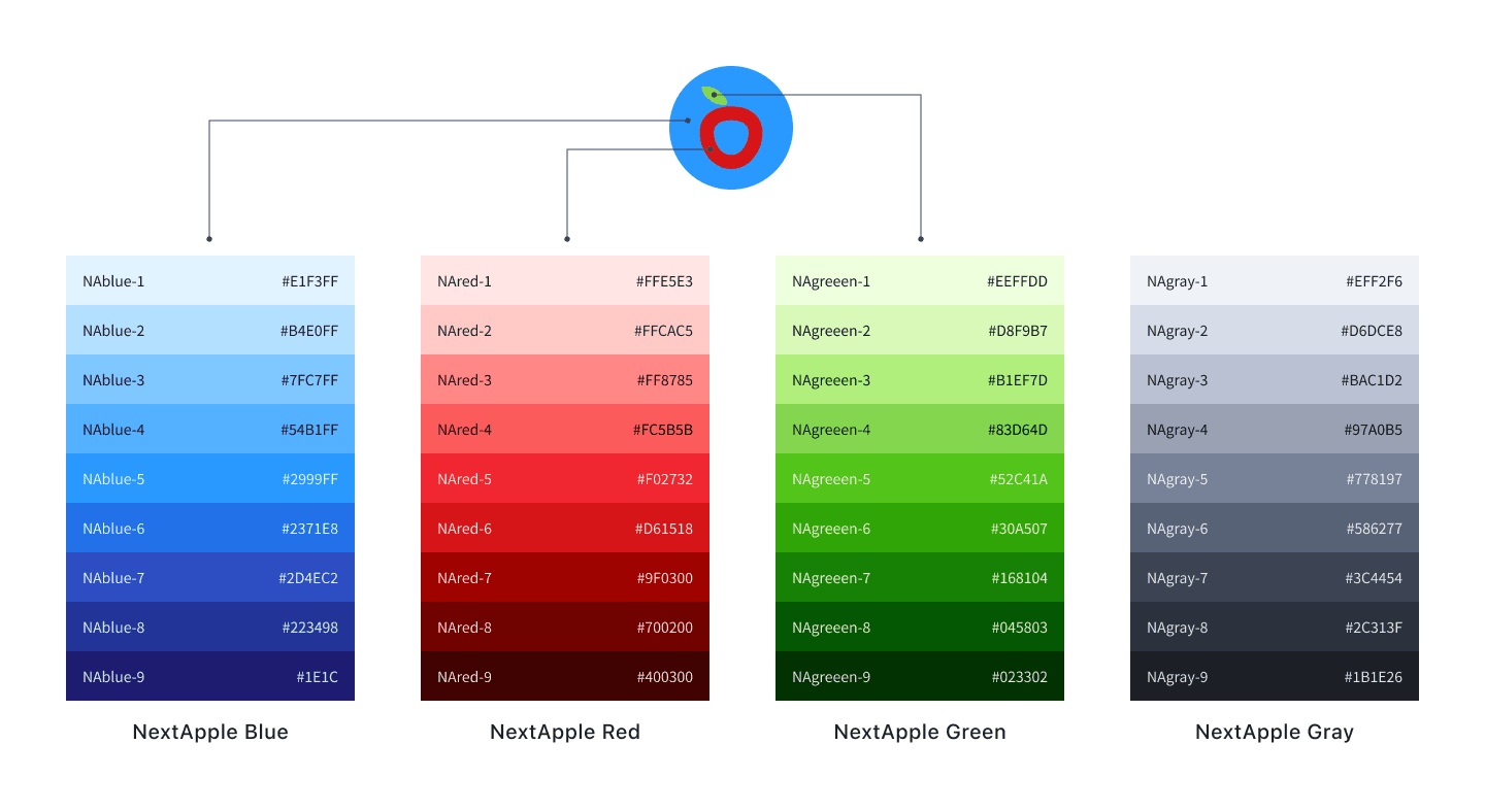 取用壹蘋新聞網品牌色,將藍色設為主要用色,象徵冷靜、專業、中立的新聞立場;另取蘋果 logo 的紅色及綠色作為輔助色,使用在重點提示、次要的元件配色上。另外也個別建立了九種色彩級距,以滿足各種應用情況。